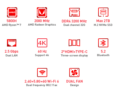 • USB 3.2×3; USB2.0 x 1; HDMI x 2; Type-C(PD Chrage) x 1; RJ45 Gigabit Ethernet 1000MBps/S x 1;